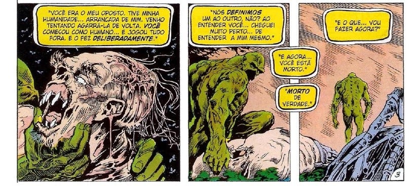 Mas essas mudanças completas no conceito e na origem do personagem não foram suficientes. Em uma jornada de autoconhecimento e existencialismo, Alan Moore desconstrói esse personagem mais algumas vezes. Ele fez do monstro uma planta, depois um elemental, do elemental uma consciência coletiva, até torná-la um deus.