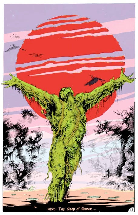 Então, antes de mergulharmos nos brejos da Louisiana e na história de Alec Holland, quero pontuar suas influências e seu impacto, não só nos quadrinhos, mas na cultura pop dos últimos quarenta anos. Quando eu terminar, talvez você concorde com o que eu vou dizer a seguir: